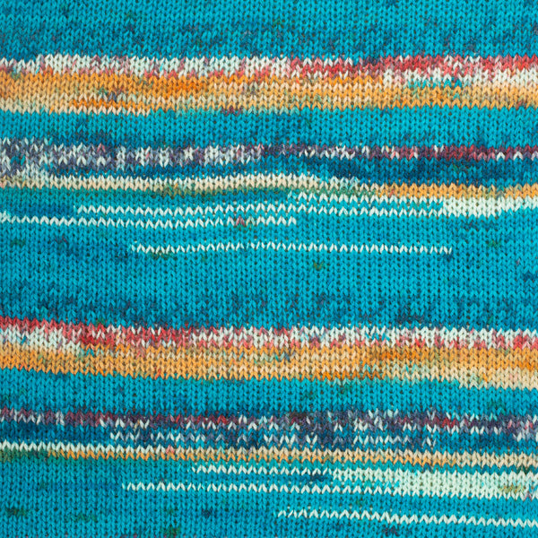 Realizzato con una miscela ben bilanciata di 75% lana superwash e 25% nylon, il punto forte di Fabel è il suo effetto self-patterning, che permette di ottenere motivi e disegni decorativi automaticamente mentre si lavora a maglia. Questo filato è tinto in modo da creare strisce, pois, o motivi sfumati che emergono senza la necessità di cambiare fili o seguire schemi complessi.