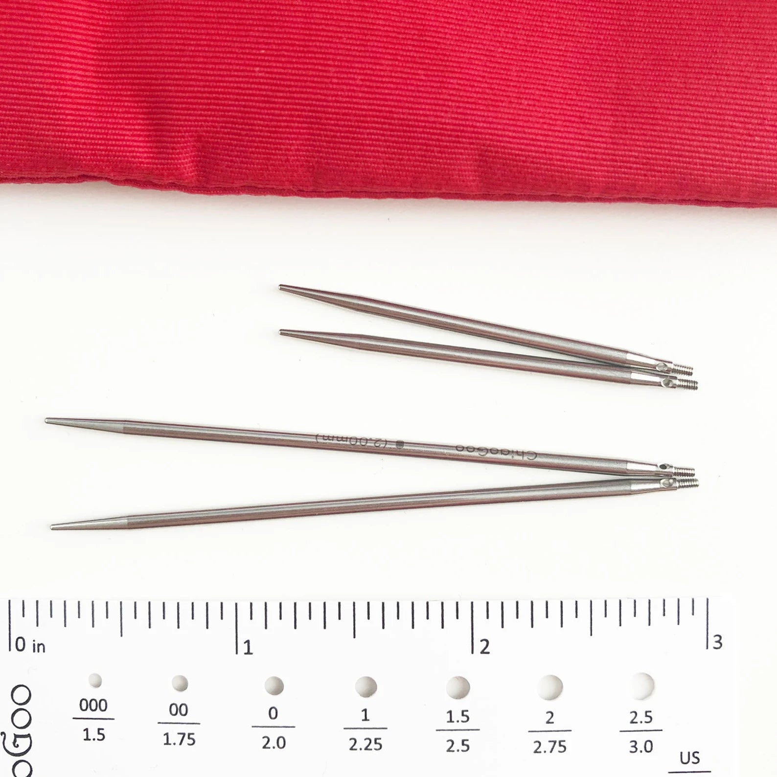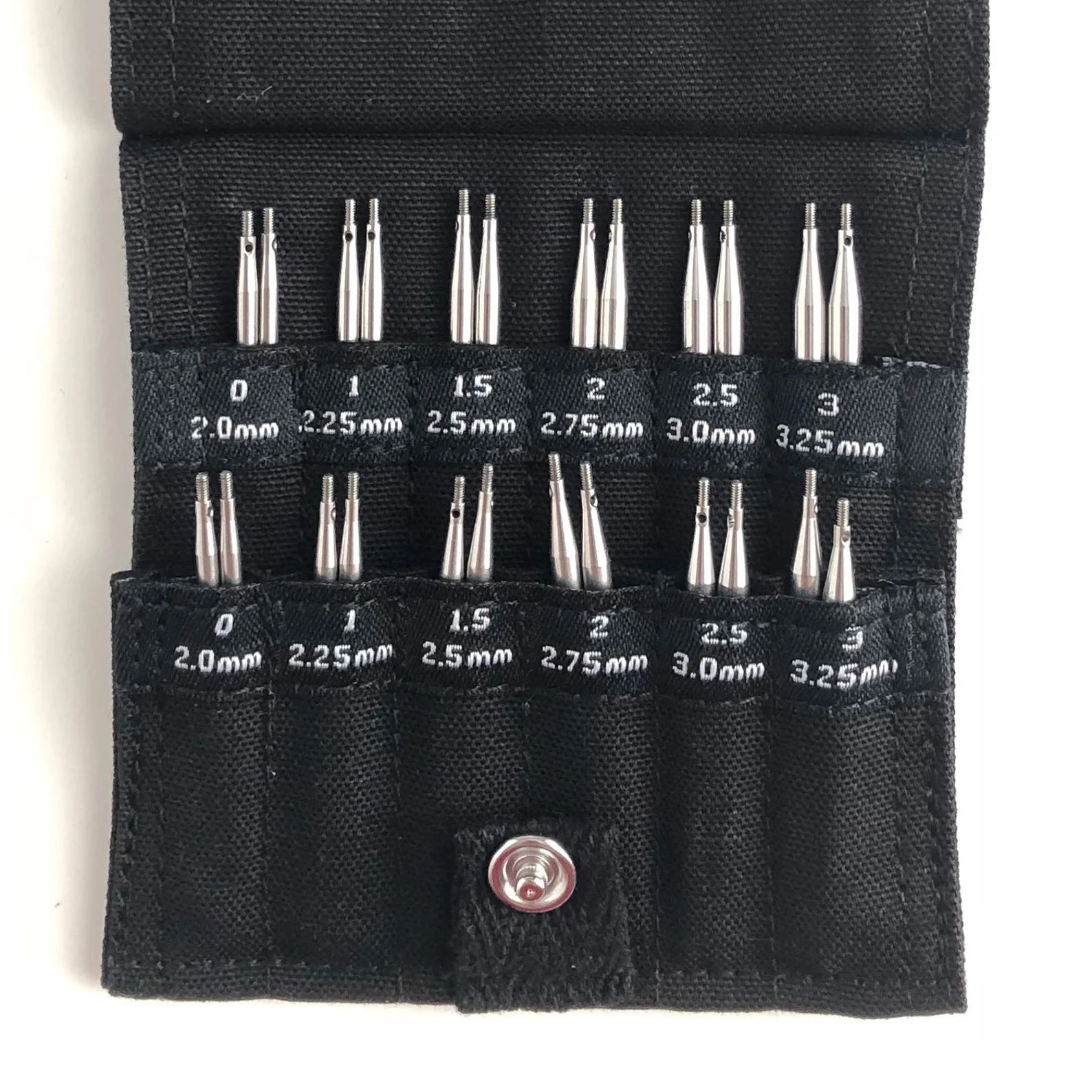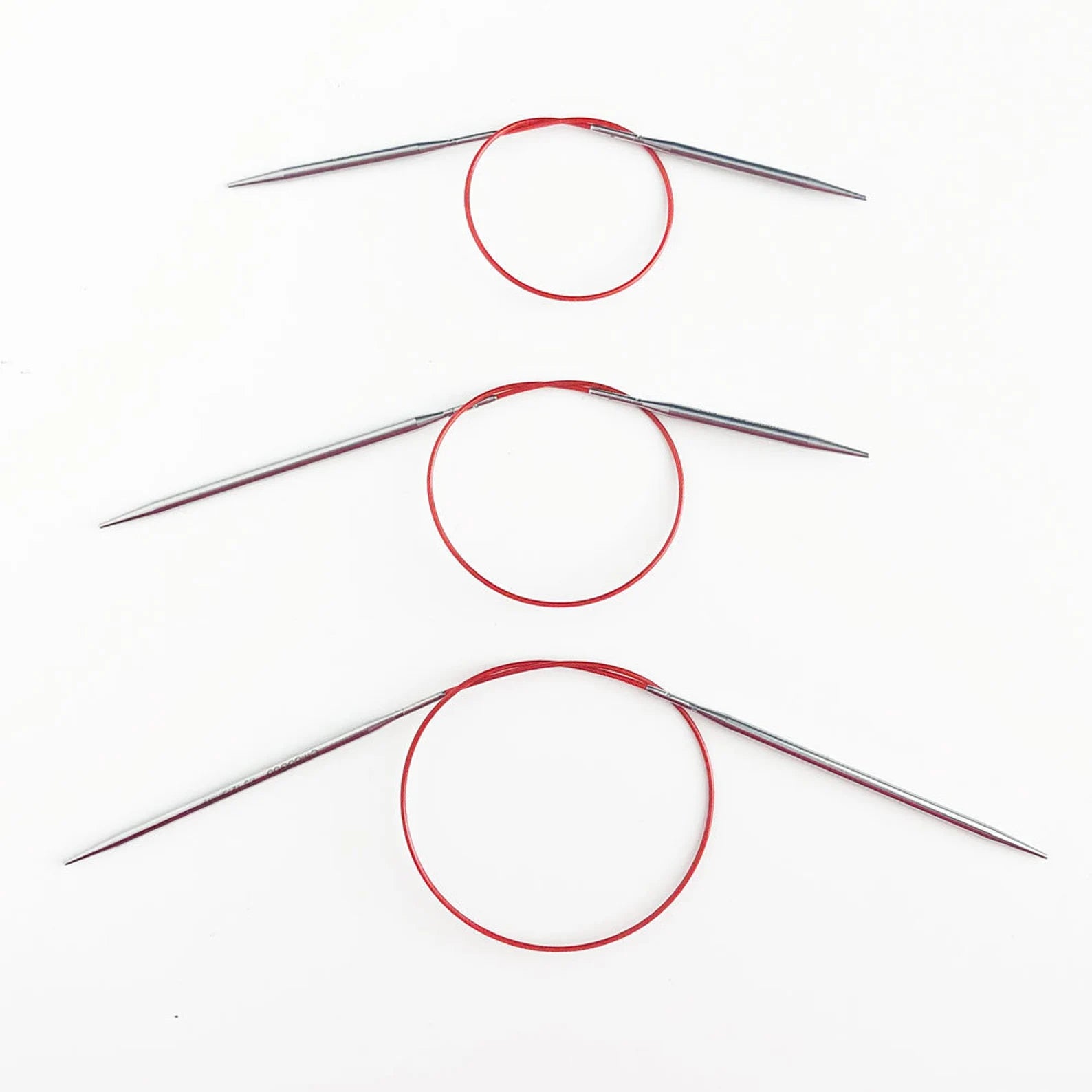 Include punte in acciaio inox chirurgico da 5 cm (2") e 8 cm (3") che si avvitano saldamente ai cavi per creare circolari di varie lunghezze. Le punte sono lisce, durevoli e garantiscono una scorrevolezza ottimale dei punti, senza intoppi.
